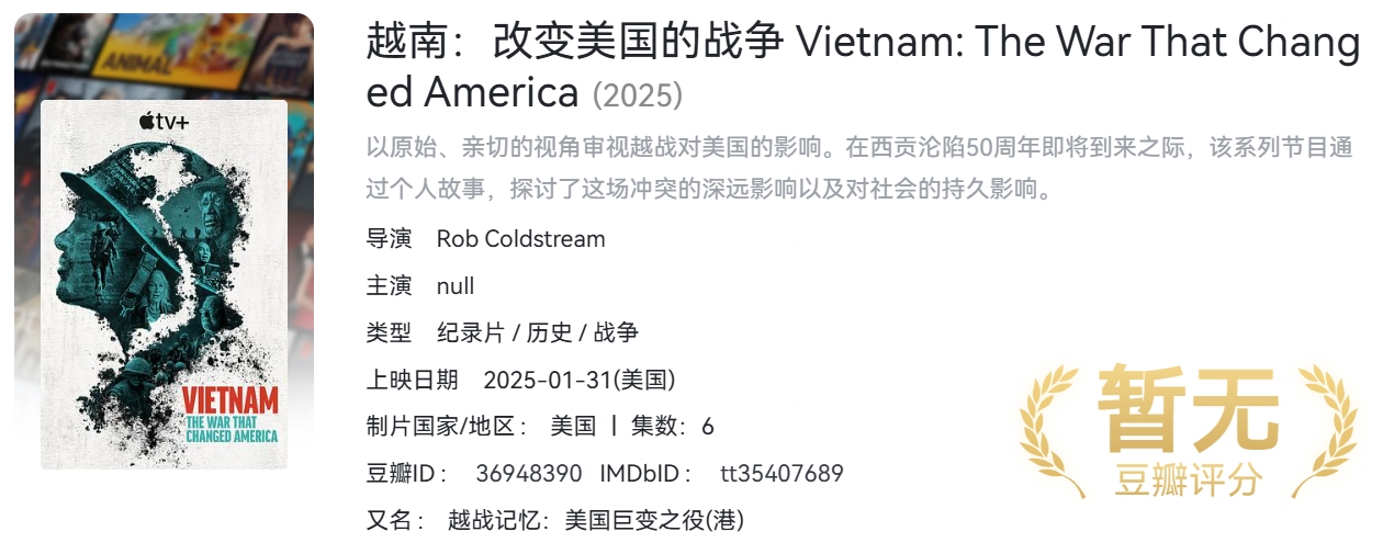 【新片】美国战争纪录片《越南:改变美国的战争》(2025)全6集.1080P中文字幕【6.3G】 栏目:纪录片 作者:哈皮 时间:2025-02-26 09:38:56   **剧情简介:** 以原始、亲切的视角审视越战对美国的影响。在西贡沦陷50周年即将到来之际,该系列节目通过个人故事,探讨了这场冲突的深远影响以及对社会的持久影响。 **网络热评:** 说白了,人家自己已经反思了几十年,大可不用我们来悲天悯人。但扔直升机真的还是惊到了我,这和最后大使馆的宪兵认为的上帝显灵真的是美国人最擅长的拯救大兵模式。 > [!success] **资源链接** > [https://pan.quark.cn/s/28c1227df174](https://pan.quark.cn/s/28c1227df174 "https://pan.quark.cn/s/28c1227df174") 版权声明:本站不存储任何实质资源,该帖为发布的网盘链接介绍帖。如您认为本站任何介绍帖侵犯了您的合法版权,请联系站长 ( 微信:qbqb0925 ) 进行投诉,我们将在确认本文链接指向的资源存在侵权后,立即删除相关介绍帖子!