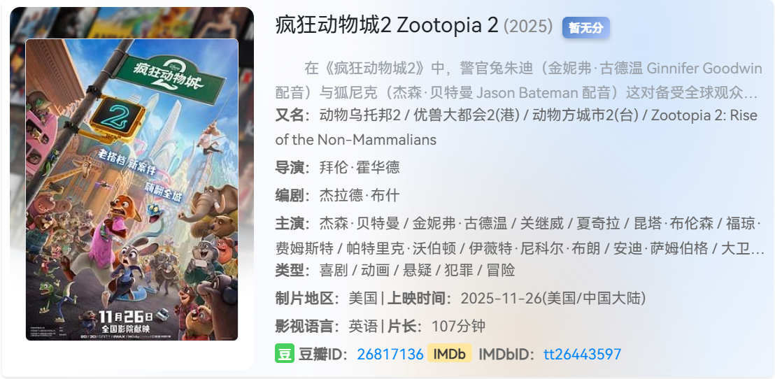 电影:疯狂动物城2 (2025) 高清版 [ 附第一部 ] [ 2025年11月26日上映 ] 栏目:电影区 作者:哈皮 时间:2025-12-02 06:57:47   **简介:** 5天前刚上映的动画电影,想看的趁早转存,这种资源的失效速度都很快! > [!success] **资源链接** > https://pan.quark.cn/s/672dd0e01109 版权声明:本站不存储任何实质资源,该帖为发布的网盘链接介绍帖。如您认为本站任何介绍帖侵犯了您的合法版权,请联系站长 ( 微信:qbqb0925 ) 进行投诉,我们将在确认本文链接指向的资源存在侵权后,立即删除相关介绍帖子!