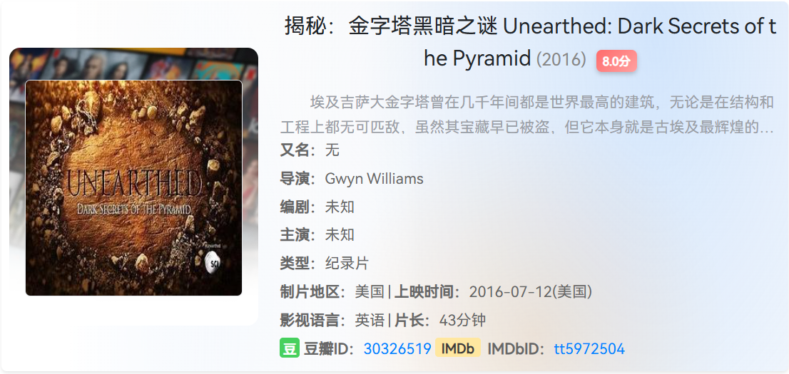 【豆瓣高分纪录片】揭秘:金字塔黑暗之谜 HD1080P 栏目:纪录片 作者:哈皮 时间:2025-12-23 09:54:42   **简介:** **爱悬疑的小伙伴必看纪录片,超级 "解压"!**话不多说,老样子,下方自取。 > [!success] **资源链接** > https://pan.quark.cn/s/62b8019ed997 版权声明:本站不存储任何实质资源,该帖为发布的网盘链接介绍帖。如您认为本站任何介绍帖侵犯了您的合法版权,请联系站长 ( 微信:qbqb0925 ) 进行投诉,我们将在确认本文链接指向的资源存在侵权后,立即删除相关介绍帖子!