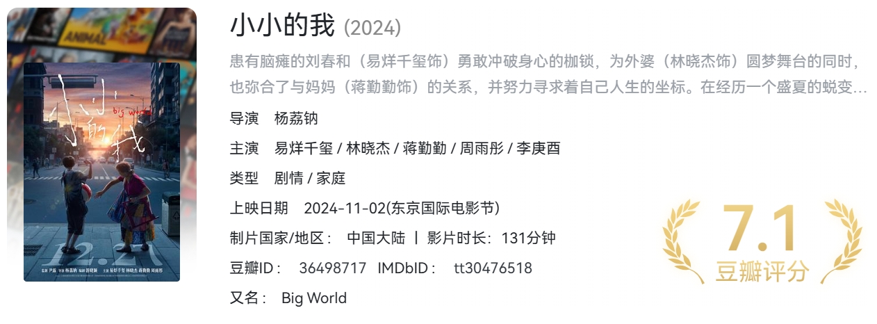 小小的我(2024)正式版 易烊千玺【4K HQ 高码率 60帧率版】【DTS5.1环绕声】国语中字【24.2G】 栏目:电影区 作者:哈皮 时间:2025-02-05 09:58:04   **剧情简介:** 患有脑瘫的刘春和(易烊千玺饰)勇敢冲破身心的枷锁,为外婆(林晓杰饰)圆梦舞台的同时,也弥合了与妈妈(蒋勤勤饰)的关系,并努力寻求着自己人生的坐标。在经历一个盛夏的蜕变后,他终于踏上了新的旅程。 > [!success] **资源链接** > [https://pan.quark.cn/s/1adb6e40d0a9](https://pan.quark.cn/s/1adb6e40d0a9 "https://pan.quark.cn/s/1adb6e40d0a9") 版权声明:本站不存储任何实质资源,该帖为发布的网盘链接介绍帖。如您认为本站任何介绍帖侵犯了您的合法版权,请联系站长 ( 微信:qbqb0925 ) 进行投诉,我们将在确认本文链接指向的资源存在侵权后,立即删除相关介绍帖子!
