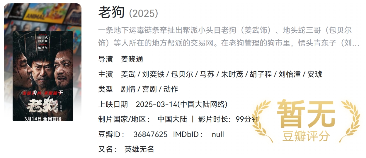 老狗 (2025)【4K / EDR / 高码率】【内封简中】【10.9GB】【姜武 / 刘奕铁 / 包贝尔】 栏目:电影区 作者:哈皮 时间:2025-03-15 15:08:00   **剧情简介:** 一条地下运毒链条牵扯出帮派小头目老狗(姜武饰)、地头蛇三哥(包贝尔饰)等人所在的地方帮派的交易网。在老狗管理的狗市里,愣头青东子(刘奕铁饰)阴差阳错地卷入这场漩涡中,并获得老狗赏识成为其最心腹的小弟。帮派老大葛爷的离奇暴毙,让权力真空引发惨烈厮杀,几大狠人血拼上位,神秘势力暗中操盘,然而东子的身份也似乎并不简单。在情谊和生死面前,人性赌局的考验也让事态变得越来越扑朔迷离。 > [!success] **资源链接** > [https://pan.quark.cn/s/013fba70c938](https://pan.quark.cn/s/013fba70c938 "https://pan.quark.cn/s/013fba70c938") 版权声明:本站不存储任何实质资源,该帖为发布的网盘链接介绍帖。如您认为本站任何介绍帖侵犯了您的合法版权,请联系站长 ( 微信:qbqb0925 ) 进行投诉,我们将在确认本文链接指向的资源存在侵权后,立即删除相关介绍帖子!