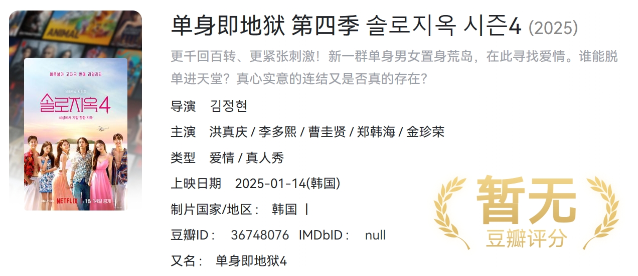 【2025韩综】《单身即地狱 第四季》 【同步更新】【附1-3季】[韩国]【1080P】【77.2G】【官中字幕】 栏目:综艺区 作者:哈皮 时间:2025-06-10 17:18:14   **简介:** 俊男靓女被困“地狱岛”,逃离方法只有一个:每晚与某人成为情侣。配对成功的人当晚可搬去“天堂岛”,享受优质食物和住宿,而未找到伴的人,晚上得在“地狱岛”自力更生 > [!success] **资源链接** > [https://pan.quark.cn/s/da1b74919f23](https://pan.quark.cn/s/da1b74919f23 "https://pan.quark.cn/s/da1b74919f23") 版权声明:本站不存储任何实质资源,该帖为发布的网盘链接介绍帖。如您认为本站任何介绍帖侵犯了您的合法版权,请联系站长 ( 微信:qbqb0925 ) 进行投诉,我们将在确认本文链接指向的资源存在侵权后,立即删除相关介绍帖子!