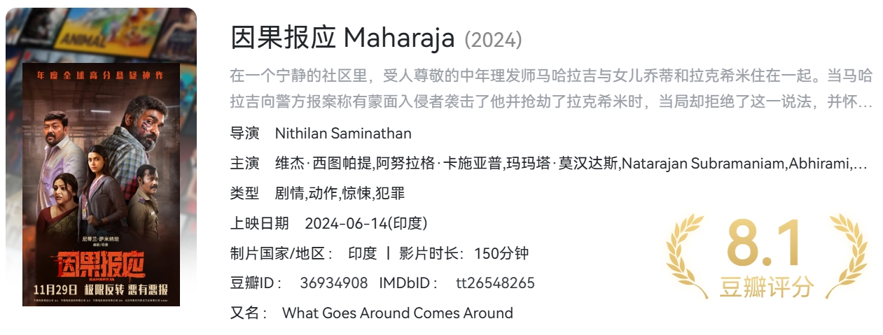 因果报应(2024)【NF / 4K / SDR / 高码率】【杜比5.1音效】【简英特效字幕】【印度高分电影】【16.4G】 栏目:电影区 作者:哈皮 时间:2025-01-04 08:41:01    **简介:** 在一个宁静的社区里,受人尊敬的中年理发师马哈拉吉与女儿乔蒂和拉克希米住在一起。当马哈拉吉向警方报案称有蒙面入侵者袭击了他并抢劫了拉克希米时,当局却拒绝了这一说法,并怀疑她所失财物的真实性。尽管他多次试图寻求帮助,但他还是不惜一切代价,甚至在女儿回来之前亲自调查。随着疑点越来越多,大君的理智受到质疑,谜团也越来越深。 > [!success] **资源链接** > [https://pan.quark.cn/s/b4f3ed9e1c5c](https://pan.quark.cn/s/b4f3ed9e1c5c "https://pan.quark.cn/s/b4f3ed9e1c5c") 版权声明:本站不存储任何实质资源,该帖为发布的网盘链接介绍帖。如您认为本站任何介绍帖侵犯了您的合法版权,请联系站长 ( 微信:qbqb0925 ) 进行投诉,我们将在确认本文链接指向的资源存在侵权后,立即删除相关介绍帖子!